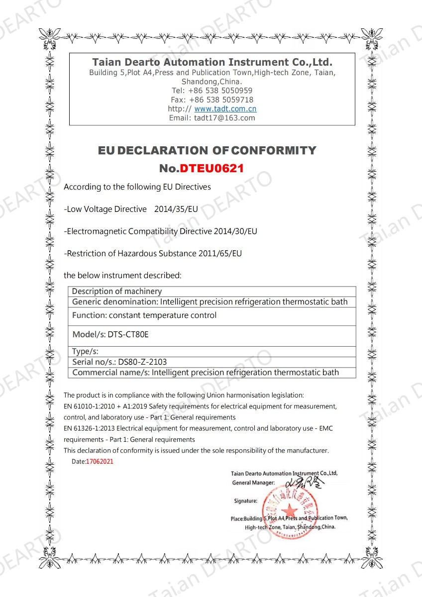 After nearly a month of repeated communication and confirmation with Italian buyers and active cooperation with upstream suppliers, our DTS-CT series of constant temperature tank products have finally obtained CE certification and will be exported to Italian market at the end of July, laying a good foundation for our products to export to EU and enter the high-end market in the future.Attached are our EU-DOC declaration documents and CE labels.